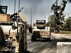 During the Iraq War, the vulnerability of American supply convoys became apparent as soon as March 2003, when a maintenance unit was ambushed in Nasiriyah, with eleven soldiers killed and five taken prisoner, including Pfc. Jessica Lynch.[11] Not until June 2003 during the post-invasion phase of the war, did the Iraqi insurgents begin attacking convoys with regularity, which led to the re-invention of the gun truck. The truck units initially used sandbags and plywood as outlined in FM 55-30, but experienced the same problems as encountered in Vietnam.