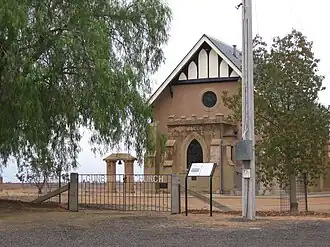 During the period January 1881 to June 1884 Protestant services were conducted in the Gunbar Hotel by the Presbyterian minister, Samuel A. Hamilton (based at Hay), for which service the congregation subscribed £50 per annum. A church was constructed and opened in July 1884 at the site of the surveyed village (north of the original settlement) where it stood until 1914, when it was taken down in sections by a contractor from Hay and re-located to an elevated location near Gunbar village. The Presbyterian church was re-opened at its new location in June 1914.[13]