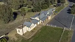 The goods shed is a standard side platform-type timber framed corrugated iron goods shed with iron bracketed roof eaves. It is of a sub type 3 design, and its dimensions are 72' x 22'. Its gabled roof is slated (not iron) and is very unusual in New South Wales. It stands on a brick base with timber platforms and extended line platforms leading to the pillar crane.[2][1]