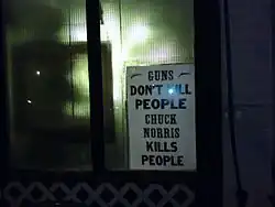"Guns don't kill people, people kill people" (and variations such as "guns don't kill people, people do" and "guns don't kill, people do") is a slogan popularized by the National Rifle Association of America (NRA) and other gun advocates.[1][2][3] The slogan and connected understanding dates back to at least the 1910s, and it became widely popular among gun advocates in the second half of the 20th century, so much so that some have labeled it a cliché. The statement, its variants, and counter-variants have been positively or negatively referenced and paraphrased by both sides of the gun control debate, including NRA representatives, the President of the United States, lawmakers, and members of the general public. Gun control proponents believe the slogan is an example of bumper sticker logic and supports the larger folk psychology behind gun advocacy.