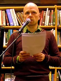 ![]() Norwegian author Gunstein Bakke reading from his book Maud og Aud at an evening of literature in Bygland, Norway. | |