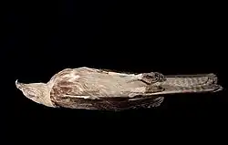 Juveniles have brown scapular feathers, wing coverts, and back, mottled with gray and buff. The black tail is faintly barred, and the head and underparts are light brown fading into a cream-colored belly and legs.