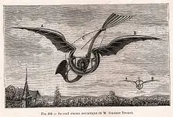 He next built an ornithopter, the wings of which flapped using a rapid succession of gun cartridges, enabling it to make a noisy but at the time unheard-of flight of 80 meters.[21]