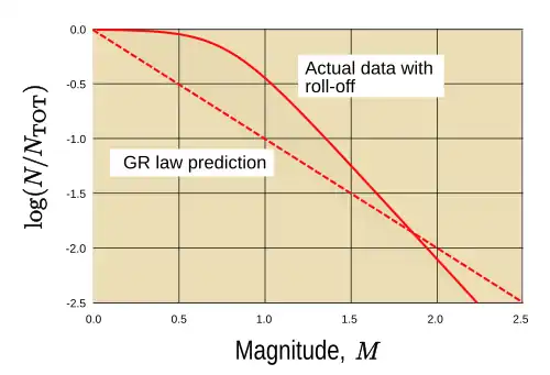 There is an apparent b-value decrease for smaller magnitude event ranges in all empirical catalogues of earthquakes. This effect is described as "roll-off" of the b-value, a description due to the plot of the logarithmic version of the GR law becoming flatter at the low magnitude end of the plot. This may in large part be caused by incompleteness of any data set due to the inability to detect and characterize small events. That is, many low-magnitude earthquakes are not catalogued because fewer stations detect and record them due to decreasing instrumental signal to noise levels. Some modern models of earthquake dynamics, however, predict a physical roll-off in the earthquake size distribution.[13]
