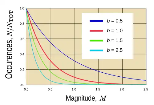 The parameter b (commonly referred to as the "b-value") is commonly close to 1.0 in seismically active regions. This means that for a given frequency of magnitude 4.0 or larger events there will be 10 times as many magnitude 3.0 or larger quakes and 100 times as many magnitude 2.0 or larger quakes. There is some variation of b-values in the approximate range of 0.5 to 2 depending on the source environment of the region.[5] A notable example of this is during earthquake swarms when b can become as high as 2.5, thus indicating a very high proportion of small earthquakes to large ones.