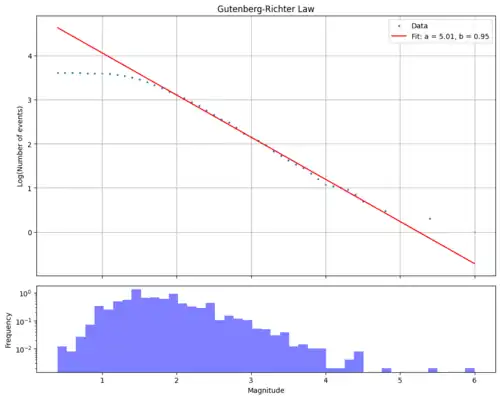 The relationship between earthquake magnitude and frequency was first proposed by Charles Francis Richter and Beno Gutenberg in a 1944 paper studying earthquakes in California,[2][3] and generalised in a worldwide study in 1949.[4] This relationship between event magnitude and frequency of occurrence is remarkably common, although the values of a and b may vary significantly from region to region or over time.
