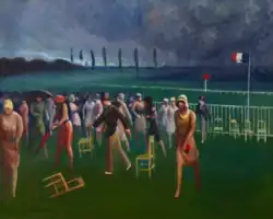 His work is in numerous museum collections, including the Smithsonian American Art Museum, the National Gallery of Art, the Phillips Collection, the Montgomery Museum of Fine Arts, the Brooklyn Museum, the Whitney Museum of American Art, the Pennsylvania Academy of the Fine Arts and the University of Virginia Art Museum. A mural by Pène du Bois titled "John Jay at His Home" was completed in 1938 and installed in the United States Post Office in Rye, NY during the WPA era. [10] There is a mural by Guy Pène du Bois in the Saratoga Springs New York Post Office, "Saratoga in Racing Season" 1937, oil on canvas, two panels.