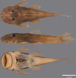 The species is discovered in 2005 by a team of 13 scientists who explored a region about 80 miles southeast of Paramaribo. It was first referred to as "Guyanancistrus ‘big mouth’", because of its unusually large mouth[8][9][10] before being formally described in 2018. The name nassauensis is a reference to the distribution of the species which is only known in streams in the Nassau Mountains. The holotype, collected in 2006, is preserved in the collections of the Natural History Museum of Geneva (MHNG), and paratypes are deposited in the Genevan institution, the Auburn University Museum of Natural History (AUM) and the National Zoological Collection of Suriname (NZCS).[5]