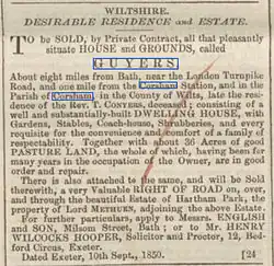 Reverend Timothy Conyers was born in about 1790. After his father died his mother Susan married in 1812 Reverend Henry Brindley who was famous for his speeches against cruelty to animals. Brindley died in 1819 and Timothy Conyers went to live with his widowed mother. They moved to Guyers House in about 1830 and in 1835 his mother died. After this Timothy married Eliza Richards who was 30 years his junior and the couple remained at Guyers until 1850. When Timothy died in 1850 the house was put on the market for sale. The sale notice is shown.