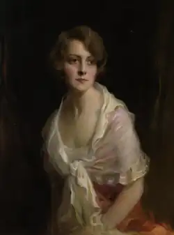 She met lawyer Claud Mullins at a dinner party in November 1924. By December, they were unofficially engaged, although her parents were not impressed by his lineage, his mother's family being “in trade”.[5] After intense discussions and interviews, they were officially engaged in February 1925. Her father made a “settlement” for Gwen of £20,000 (equal to £1 million in 2024).[6] Before her wedding, she was painted by the Anglo-Hungarian artist Philip de László. She and Claud were married on 28 May 1925 at Holy Trinity Church, Brompton.[7] She gave birth to their first child, Ann, by Caesarean section on 29 March 1926. Years later, she would confide that “the moment the baby was placed in her arms, she knew she did not like it.”[8] She had a second daughter, Barbara, also by Caesarean section, on 8 December 1927.[9]