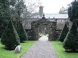 The raised terrace contains an imposing Renaissance arch, probably dating from the 1590s. The Old Dutch garden contains ancient yew topiary and an octagonal fountain. The Royal and Statesman's gardens contain Welsh Oaks planted during the royal visit of 1899, and in 1911. An Elizabethan causeway called the Chinese Walk runs across the fields to the River Conwy, where the remains of the Gwydir Quay can be seen. The River Conwy was tidal up to this point, but silting has limited most tides to below Gowers Bridge.