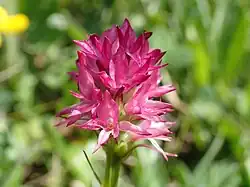 Gymandenia dolomitensis is part of the Gymnadenia miniata species complex and hard to distinguish from Gymnadenia miniata, Gymnadenia bicolor and Gymnadenia hygrophila.[2] Flower color is red with a hint of purple, bottom flowers getting a lighter, pinkish color with age. Flowers are widely opened with the lip bent upwards and the side sepals folded in.[3]