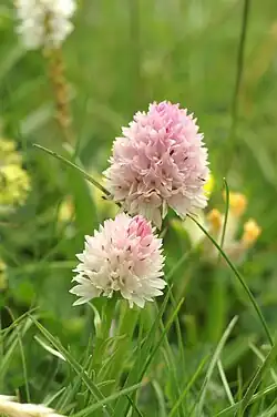 Gymandenia lithopolitanica have a short and dense inflorescence in a spherical or dome to slightly oval shape. The flower color is from an intense pink to pink to slightly purplish pink and very light pink. Lowermost flowers get lighter and are almost white when the plant is in full bloom. The color of the buds is darker than that of the flowers. They bloom from June to mid July.[2]