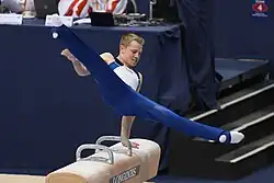 The pommel horse consists of a horizontal body with two pommels, or handles. Gymnasts perform by using their hands to support themselves on the horse. A typical pommel horse exercise involves both single-leg and double-leg work. Single-leg skills are generally found in the form of scissors, an element often done on the pommels. Double leg work, however, is the main staple of this event. The gymnast swings both legs in a circular motion (clockwise or counterclockwise depending on preference) and performs such skills on all parts of the apparatus. To make the exercise more challenging, gymnasts often include variations on a typical circling skill by turning (moores and spindles) or by straddling their legs (flares). Routines end when the gymnast performs a dismount, either by swinging his body over the horse or landing after a handstand variation.