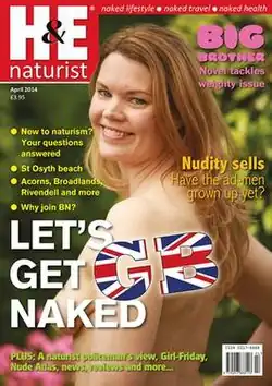 H&E naturist (originally Health and Efficiency) is a 92-page monthly commercial magazine focusing on the naturist lifestyle, through articles on travel, health and culture, as well as various features on arts and books with a naked theme.[1] This content and focus has sometimes caused it to be accused of appealing to consumers of pornography, although sexual nudity is absent from its pages.