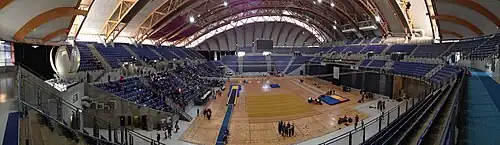 The structure is dug out of the ground so it does not appear monumental in size from the outside. The roof consists of four sections held up by double trussed beams in glued laminated timber, with lengths up to 85.4 meters (280 ft). The hall is 127 meters (417 ft) long and has a total surface area of 23,000 square meters (250,000 sq ft).[8] The main hall has a floor area of 3,500 square meters (38,000 sq ft), with an activity area of 76 by 44 meters (249 by 144 ft). The maximum ceiling height is 40 meters (130 ft), and there is a direct drive-in entrance to the hall for exhibitions. The venue has a capacity for 11,500 seated spectators. The stands are flexible and telescopic, allowing for flexibility in hall use and seating capacity. The arena can be configured with a 330 square meters (3,600 sq ft) stage. The hall can be set up to serve 2,000 people at a banquet, or divided up to serve smaller groups. The venue also features a cafeteria which can seat 200 people. For trade fairs, the venue offers 3,500 square meters (38,000 sq ft), in addition to the VIP and lobby facilities. The same area can also be used for conferences, and the venue can be split up into section to create group rooms, theme rooms and banquet rooms.[8][11]