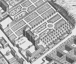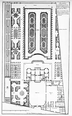 A plan of the house and gardens as they were in 1752,[5] shows the deep terrace at the rear with a few wide bowed steps that led to matching parterres containing shaped compartments set in gravel and surrounded by shrubs tightly clipped in cones which flanked a wide central gravel walk. To the left of the deep cour d'honneur and entered from it, neatly clipped cabinets de verdure—small open-air rooms and recesses in fanciful shapes, connected by short galleries—were cut into solid greenery. To the right of the court was a subsidiary stable courtyard. Soon the gardens were swept away by the duc de Biron, in favour of a miniature park à l'Anglaise, achieved with trelliswork. When the "comte du Nord", the future Paul I of Russia, and his countess (who were traveling technically incognito for pleasure) visited Paris in 1782, they toured the garden, "one of the wonders of Paris, admiring the beauty of the flowers and the variety of the borders. They walked among the flower beds and the shrubberies, marvelling at the boldness and elegance of the trellis work forming gateways, arcades, grottoes, domes, Chinese pavilions..."[6]