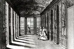 Both painters worked on the internal decoration for almost five years, producing the gallant allegories of Le Brun's grand Galerie d'Hercule (still in situ, but heavily damaged in the 2013 fire described below) and the small Cabinet des Muses, with five canvases by Le Sueur that were purchased for the royal collection (now in the Louvre) and the earlier ensemble, the Cabinet de l'Amour, which in its original configuration featured an alcove for a canopied bed upon which the lady of the house would receive visitors, according to the custom of the day. Significantly the alcove was eliminated about 1703.[2] All the ensembles featured themes of love and marriage. However, the paintings have since been dispersed.[3]
