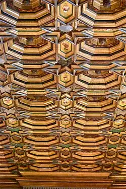 Internally, the principal rooms include the wedding hall in the south-east corner of the building, which featured a ceiling decorated in the Hispano-Moorish style, which was created in the early 16th century.[6] The room was richly redecorated in the early 19th century in anticipation of a visit by Napoleon which failed to take place.[7] Another prominent room was the Salle Arago, which served as the council chamber for the city council and was decorated with early-20th century paintings by Henri Perrault, depicting Hannibal's crossing of the Alps in 218 BC,[8] the oath by John II of Aragon to protect Perpignan following the Catalan Civil War in 1473,[9] and the French victory at the Battle of Peyrestortes in 1793.[10][11]