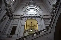 The main block contained the civic reception rooms, included the Salle Pierre de Roubaix on the ground floor, which featured a mural by Jean-Joseph Weerts depicting the proclamation of the drapers' charter, granting the town's drapers the rights "to drape cloth of all wools" in 1469.[10] The left-hand pavilion was allocated to the local chamber of commerce, while the right-hand pavilion was used by staff responsible for the delivery of municipal services.[2]