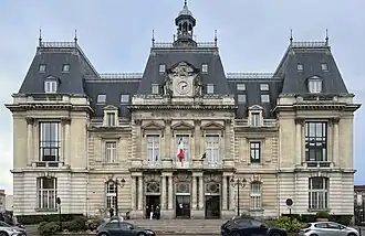Following the French Revolution, the town council initially rented premises for its meetings, but held a ball to celebrate after establishing its first municipal offices in 1839.[2] However, within two decades this building was dilapidated and cramped and, in May 1864, the council decided to relocate to the home of the Mayet family at No. 1 Avenue de Condé, near Place de l'Église.[3] A few years later, the town council considered the matter again and decided to relocate to a more central location. The site they selected, on the south side of what is now Avenue Victor Hugo, was owned by Sieur Mahieu. The new building was designed by Henri Ratouin in the Louis XIII style, built in ashlar stone and was completed in 1876.[4]