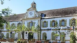 In 1825, the town council, which had previously operated without a dedicated town hall, decided to use the building as its regular meeting place. The use of the building for municipal purposes was regularised in 1828, when the mayor, Urbain Marin, persuaded the minister for the colonies, Christophe de Chabrol de Crouzol to transfer ownership from the French Government to the town council. Marin then initiated a series of improvements to make the building more appropriate for municipal use. These improvements included replacing the flat roof, which was dilapidated and severely leaking, with a pitched roof. They also included installing a pair of full height pilasters, flanking the central bay, to support a central pediment. The pediment contained a clock and was supported by scrolls, and an octagonal belfry was placed behind it.[4] A landscaping scheme for the area in front of the building, with a fountain designed and manufactured by Fonderies d'Art Ducel in the centre of the garden, was instigated in 1861.[3]