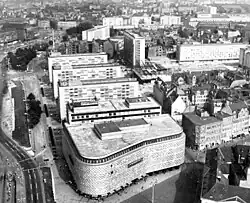 Prior to construction, the former Konsument department store on Brühl, known colloquially as the Blechbüchse (Tin Can), was demolished. A new building was constructed on the same site with the characteristic, listed aluminum façade of Harry Müller[4] which, like the other parts of the building, houses retail space in the basement and three upper floors, and parking spaces on two floors above.