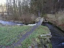 - ^ Löbersbach and Roter Bach both flow into the Eisenacher Mühlgraben (left side arm, 2,9 km), however, the Löbersbach is obviously not subordinate to its water body identification number (41694), since the sub-catchment area of the Hörsel between the Michelsbach estuary and the former Spicke reservoir - where the Mühlgraben flows into it - is only 11.6 km2, which clearly exceeds the sum of both stream catchment areas. Moreover, the Hörsel's sub-catchment area between the Nesse and Michelsbach estuary is 14.8 km2, which would not be possible on the right side of the Mühlgraben, due to the direction of the Michelsbach, so it must contain the Löbersbach. In former times, the Löbersbach and the Marienbach ran separately from each other; a branch canal that existed at times was called the "Suez Canal".