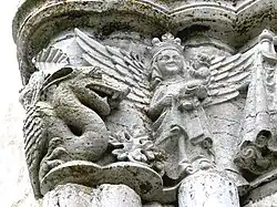 The church has two unusually richly sculptured portals. The choir portal display carved foliage and a few figures: two fish and a lion. The main portal is crowned by a sculpture of Saint Michael wielding a club and carrying a shield, sitting astride the wimperg. Underneath, the capitals are profusely sculpted with scenes from the apocalypse. Other capitals are decorated with foliage ornamentation. Both of the portals may have been made by the stone sculptor or workshop known by its modern notname Egypticus, which was active on Gotland.[2]