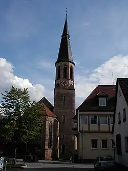 Hösbach's landmark, with its characteristic tower, is Saint Michael's parish church. The tower was included as a charge in the arms on the community's wishes, although in heraldically simplified form. The tinctures argent and gules (silver and red) refer to the community's former allegiance to the Archbishopric of Mainz. The Archiepiscopal forest officials, who oversaw things in the Spessart region on horseback, had their seat in Hösbach. The existence of this seat in Hösbach can be confirmed from the 14th century onwards. The charges on the escutcheon's sinister (armsbearer's left, viewer's right) side are attributes of this service, with the oak leaf and acorn representing the forest, and the spur the mounted officials themselves.