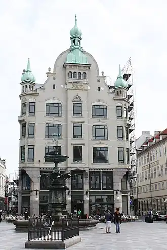 ![]() The gable of Højbrohus with the Storkespringvandet fountain in the foreground, 2009 | |