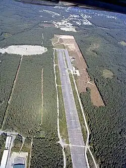 Luftwaffe soon took an interest in the airport plans and planning started in 1941. However, construction did not commence before 1943. A forest area 200 hectares (490 acres) was expropriated from Egge Farm and 200 Norwegians were hired to cut down the forest. Under the command of Erwin Keller, further construction was carried out by a combination of Organisation Todt, prisoners of war and Norwegian contractors.[3] The plan for construction was extensive and was planned as one of the largest airports in Norway.[4] This included a runway, a dummy runway on the other side of the Randsfjorden Line, a taxiway and hardened aircraft shelters, among others.[5] The airport was completed in September 1944, by which time it had received an 1,800-by-60-meter (5,910 by 200 ft) runway. It also had landing lights and an instrument landing system, as well as a Lorenz radar.[6]