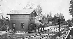 The Drammen Line past the site of Høvik Station opened as a narrow gauge railway on 7 October 1872.[1] The railway station serving Høvik opened on 1 May 1874.[2] It was the first railway station between Sandvika Station and Lysaker Station. The new means of transport allowed the Høvik area to develop as a suburban residential area allowing commuters to travel to the capital.[3] The original station building was a standard design by Georg Andreas Bull used for most stations along the Drammen Line.[4] In addition to a station building it featured a Narvesen kiosk.[5] A spur to load cars with compost and garbage was installed in 1908.[6] Bærum Municipality established a public library for Høvik in 1911. From their establishment to 1924 they were located next to the station building.[7]