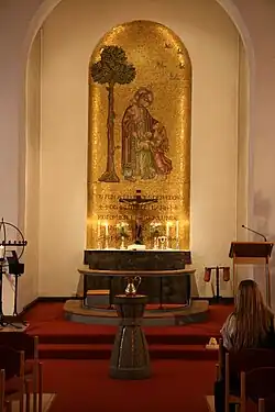 The bell tower is located in the middle of the ridge turret. The church bells are produced by Olsen Nauen bell foundry in Tønsberg. The altarpiece is a mosaic that was created in 1955 by Per Vigeland. The church organ at the organ loft is made by Jørgensens Orgelfabrikk (1974).