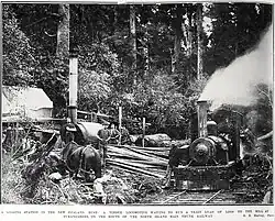 There were at least three tramway networks in the area, which took timber to sawmills and the railway. Gibbs & Trevor had a tramway running west from the station and George Gardner had tramways to the north west.[6] They had a 1927 Type Cb 0-4-4-0 built by A & G Price.[17] In 1906 a tramway ran to the PWD siding and next year, W G Irvine applied to run one beside the railway. Quin Bros siding was noted in 1909[11] and, in 1910, owners of the Hawera Sash & Door Co Ltd,[18] had a 4 mi (6.4 km) tramway linking their logging area to their mill and the railway.[19] They used a 1909 Type A 0-4-0 T built by J. Johnston's Vulcan Foundry at Invercargill and a 1914 0-4-4-0 by G & D Davidson Ltd. of Hokitika. The tramways were dismantled about 1934, when the bush had been cleared.[17][20]