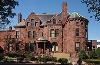 William Channing Whitney designed the H. Alden Smith house in the Richardsonian Romanesque style of architecture. Featuring a brown sandstone facade, the three-story home boasts a massive corner tower, front and side porches, and a stained-glass skylight.[4] Although much of the interior has been modified over time, the first level retains the original reception hall and grand staircase. The original parlor, dining room, library, and sitting room also remain intact. Decadent panelling and cherry woodwork can be found throughout this level.