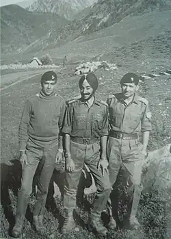 After his graduation Ahluwalia joined the Indian Army as an officer, receiving a commission as a second lieutenant in the Army Electrical-Mechanical Engineering branch on 14 December 1958.[1] He was promoted to lieutenant on 14 December 1960 and to captain on 14 December 1964.[13][14] Seeing action during the 1965 war with Pakistan, he was wounded by a bullet in his spine, which left him confined to a wheelchair. He received an early discharge from the Army on 8 January 1968,[15] with the honorary rank of major.[16]