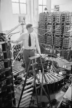 ![]() H. Richard Crane with an early synchrotron at the University of Michigan, 1949 | |
