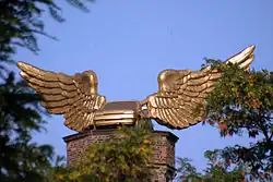 The Flügelauto (winged car) is a car as a golden bird. Created in 1991 as part of the performance Fetisch Auto (Fetish Car) in Cologne, this work of art is now displayed on the roof of the Kölnisches Stadtmuseum (Museum of the City of Cologne). Citing the protection of historic monuments, Franz-Josef Antwerpes, the former District President of Cologne, demanded the removal of the car but the competent ministry decided that the artwork could stay in place “temporarily”.[56][57]