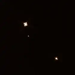 ![]() SPHERE image of HD 131399 A (top left), B and C (bottom right), and the background object (center) Credit: ESO/K. Wagner et al. | |