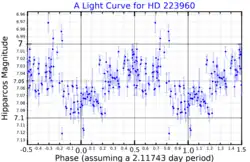 HD 223960 is tentatively classified as an α Cygni variable; its brightness changes erratically by less than a tenth of a magnitude with a primary period of about two days.[11] It is a hot supergiant star with a luminosity several hundred thousand times higher than the Sun's.