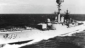 After training exercises during October, the ship made several port visits before returning to Sydney for Christmas.[1] On 7 February 1967, personnel from Derwent were involved in fighting the 1967 Tasmanian bushfires.[1] The ship was deployed to South East Asia between May and October for a series of official port visits.[1] The ship visited ports in the Philippines, Japan, Singapore, and Hong Kong.[1] Derwent was then docked for a major refit, lasting until May 1968.[1] June was spent working the ship up post-refit, and in July, Derwent visited New Zealand before sailing to South East Asia.[1] In October, the ship was deployed on another flag-showing cruise, focusing on Japan and Korea.[1] This concluded in December, with Derwent berthed in Hong Kong for the end of the year.[1] Further port visits took up the early portion of 1969, with visits to India and Sri Lanka.[1] During February, Derwent again escorted Sydney on the latter's thirteenth troop transport voyage to South Vietnam.[5][8] After this, Derwent called into Bangkok and Hong Kong, before returning to Sydney on 25 April.[1] Refit work was undertaken at Williamstown.[1] In August, Derwent visited Brisbane, then was involved in the unsuccessful search for survivors of the Australian National Line merchant vessel Noongah.[1] The ship sailed to Hawaii in September for exercises with the United States Navy, and also visited Nouméa, New Caledonia and the Marshall Islands before docking in Singapore for two weeks of maintenance.[1] Derwent then sailed back to Sydney via Christmas Island and the west and south coasts of Australia, and arrived on 11 December.[1]