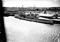 The ship was purchased by the Australian Government in 1938, with the transfer of the seaplane tender HMAS Albatross to the Royal Navy as part of the payment.[6][7] She was originally to be renamed and transferred to the RAN on 6 October, but the mobilisation of the British Home Fleet in response to the Munich Crisis brought this forward to 28 September.[7] The cruiser arrived in Australia at the end of 1938, and visited her namesake city during February 1939.[7]