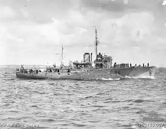HMAS Ipswich (J186/B244/A118), named for the city of Ipswich, Queensland, was one of 60 Bathurst-class corvettes built during World War II and one of 20 built on Admiralty order but manned by personnel of and later commissioned into the Royal Australian Navy (RAN).[2]