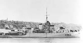 The River-class frigate was designed by William Reed of Smith's Dock Company of South Bank-on-Tees. Originally called a "twin-screw corvette", its purpose was to improve on the convoy escort classes in service with the Royal Navy at the time, including the Flower-class corvette. The first orders were placed by the Royal Navy in 1940 and the vessels were named for rivers in the United Kingdom, giving name to the class. In Canada they were named for towns and cities though they kept the same designation.[4] The name "frigate" was suggested by Vice-Admiral Percy Nelles of the Royal Canadian Navy and was adopted later that year.[5]