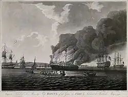 Arethusa was part of a fleet under the command of Rear Admiral Sir Henry Harvey, commander-in-chief for the Navy in the Leeward Islands, aboard Prince of Wales, that in February 1797 captured the Spanish-held Caribbean island of Trinidad. The flotilla sailed from Carriacou on 15 February and arrived off Port of Spain the next day.[12] At Port of Spain they found a Spanish squadron consisting of four ships of the line and a frigate, all under the command of Rear-Admiral Don Sebastian Ruiz de Apodaca. Harvey sent Favourite and some of the other smaller ships to protect the transports and anchored his own ships of the line opposite the Spanish squadron. At 2am on 17 February the British discovered that four of the five Spanish vessels were on fire; they were able to capture the 74-gun San Domaso but the others were destroyed.[12][c] Later that morning General Sir Ralph Abercrombie landed the troops. Captain Wolley of Arethusa superintended the landing.[13] The Governor of Trinidad, José Maria Chacón, surrendered the next day.[12] The flotilla shared in the allocation of £40,000 for the proceeds of the ships taken at Trinidad and of the property found on the island.[14]