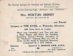 Once decommissioned, in 1874, the ship's engines were removed and she was loaned by the Admiralty to the charity that later became known as Shaftesbury Homes and Arethusa.[1] Retaining the name Arethusa, she was moored next to their existing training ship Chichester at Greenhithe, Kent. Shaftesbury Homes provided refuge and taught maritime skills to destitute young boys who had been sleeping rough on the streets of London and trained them for a career in the Royal Navy or Merchant Navy.