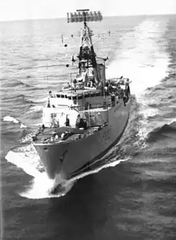 The ships were fitted with two QF 4.5-in (113 mm) Mark 5 guns, salvaged from scrapped Second World War destroyers, mounted fore and aft. It was intended to fit two Seacat anti-aircraft missile launchers, but these were not ready in time, and Gurkha completed with two 40 mm Bofors guns instead, with Seacat replacing the Bofors guns on refit. For anti-submarine and anti-ship duties, a hangar and flight deck for a single Westland Wasp helicopter was fitted, while a Limbo anti-submarine mortar provided close-in anti-submarine armament.[3][7] Gurkha was fitted with a large Type 965 long range air search radar on a lattice foremast, with a Type 993 short range air/surface target indicating radar and Type 978 navigation radar also fitted. An MRS3 fire control system was carried to direct the 4.5-inch guns.[8] The ship had a sonar suite of Type 177 medium range search sonar, Type 162 bottom search and Type 170 attack sonar.[4] Type 199 Variable Depth Sonar (VDS) was fitted in 1969.[9] The ship had a crew of 253 officers and other ranks.[3][5]
