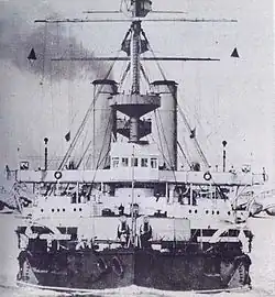 In May 1896, Hood steamed from Malta to Crete to protect British interests and subjects there during unrest among Cretan Greeks who opposed the Ottoman Empire′s rule of the island.[15] In 1897 and 1898, the ship served as part of the International Squadron, a multinational force made up of ships of the Austro-Hungarian Navy, French Navy, Imperial German Navy, Italian Royal Navy (Regia Marina), Imperial Russian Navy, and Royal Navy that intervened in the 1897-1898 Greek uprising on Crete. The squadron, which formed in February 1897, bombarded insurgent forces, put sailors and marines ashore to occupy key cities, and blockaded Crete and key ports in Greece, actions which brought organized fighting on the island to an end by late March 1897.[16] Thereafter, the squadron maintained order on Crete until the island's status finally was resolved by the evacuation of all Ottoman Army forces from Crete in November 1898 and the establishment of an autonomous Cretan State under Ottoman suzerainty in December 1898.[17]