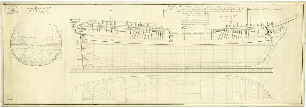 In this era it was common for each surveyor to produce independent designs for new ship types, and this design was a counterpoint to Edward Hunt's HMS Minerva; together the two draughts represent the prototype of the thirty-eight gun, 18-pounder armed frigate.[2]